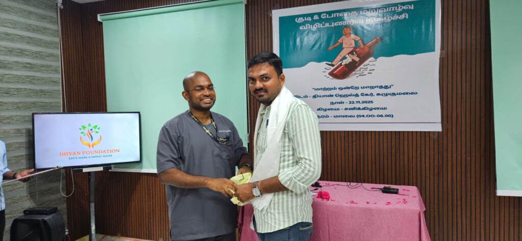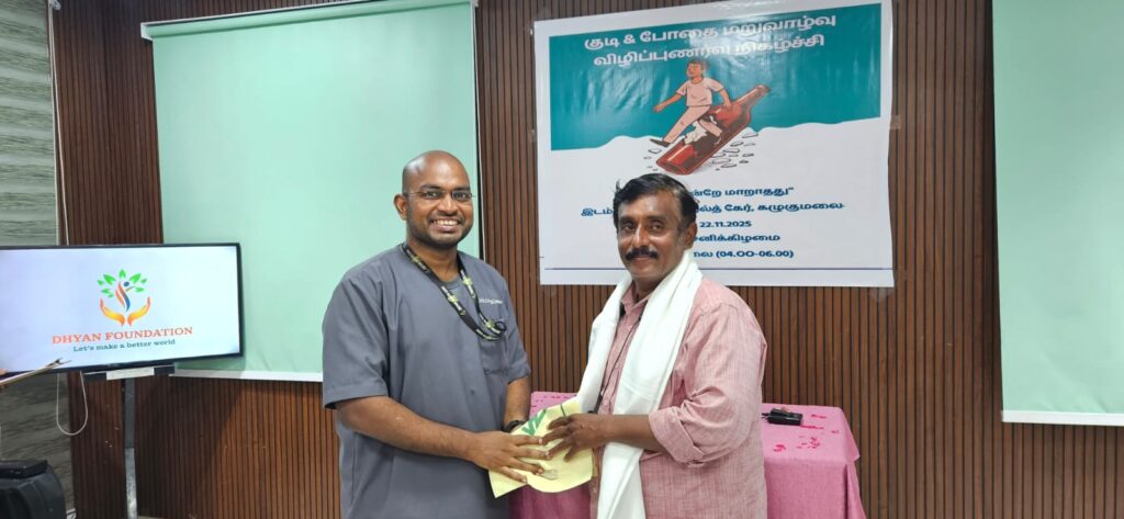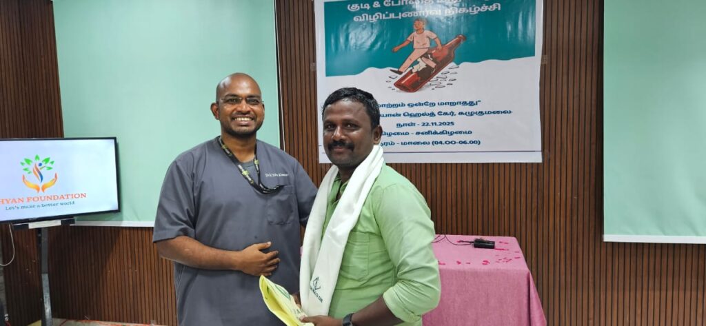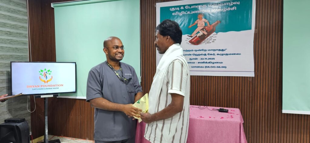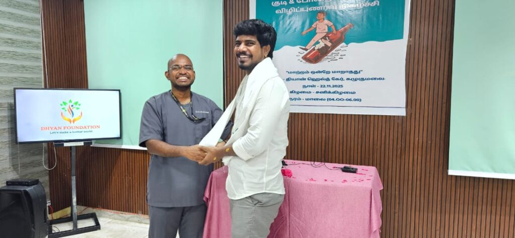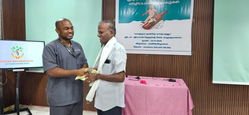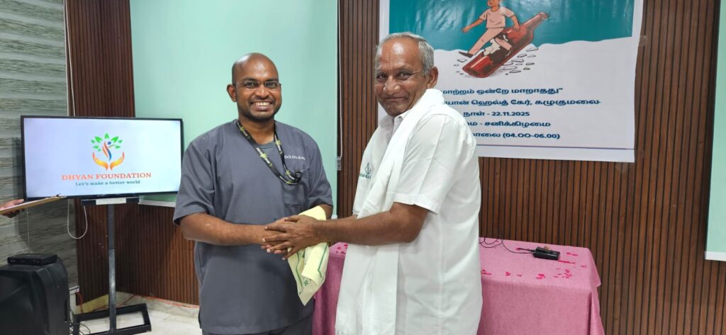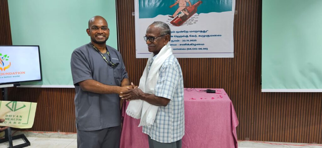 The Alcohol Rehab Awareness Program was successfully conducted at Dhyan Health Care, Kalugumalai, on 22 November 2025 from 4.00 PM to 5.45 PM. The event aimed to spread awareness about the harmful effects of alcohol addiction and to promote healthy living among the local community. It was jointly organized by Dhyan Health Care, Dhyan Foundation, and the Alcohol Anonymous team. Local people participated in good numbers and showed strong interest in the awareness activities arranged for their benefit.
