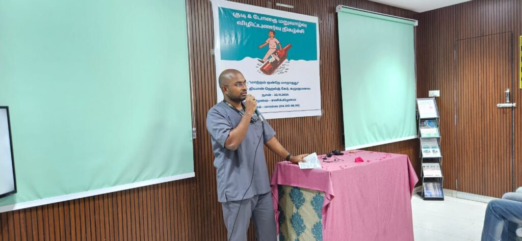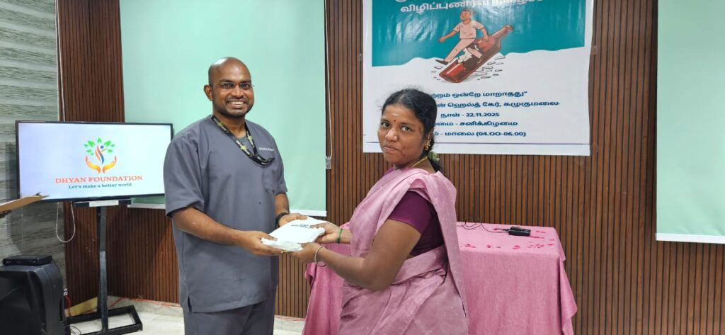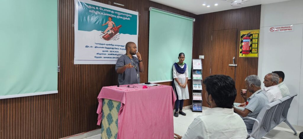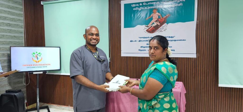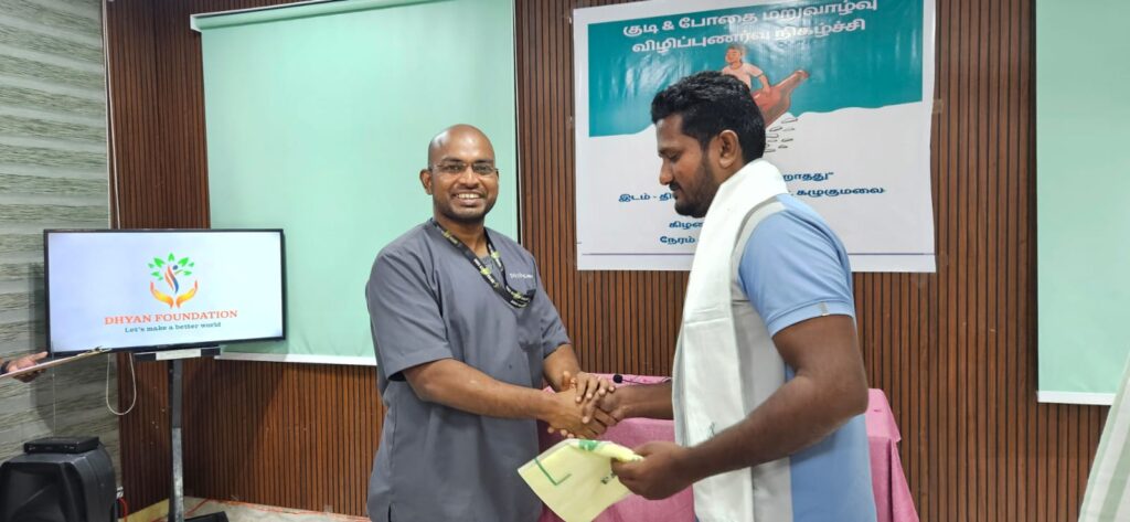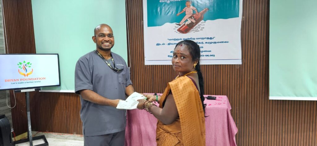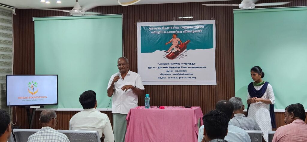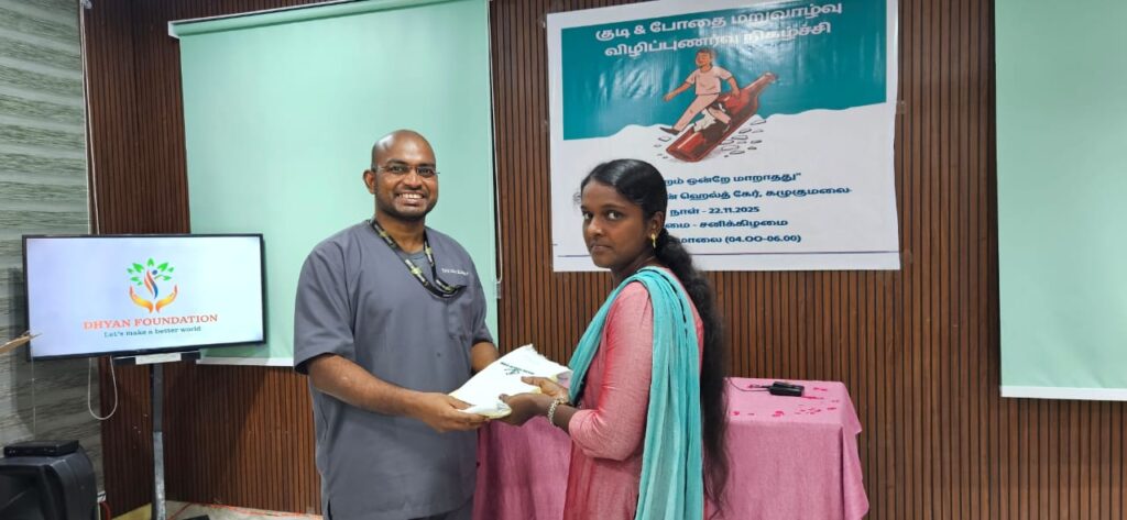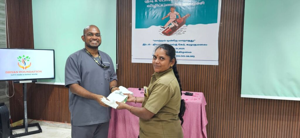 The Alcohol Rehab Awareness Program was successfully conducted at Dhyan Health Care, Kalugumalai, on 22 November 2025 from 4.00 PM to 5.45 PM. The event aimed to spread awareness about the harmful effects of alcohol addiction and to promote healthy living among the local community. It was jointly organized by Dhyan Health Care, Dhyan Foundation, and the Alcohol Anonymous team. Local people participated in good numbers and showed strong interest in the awareness activities arranged for their benefit.