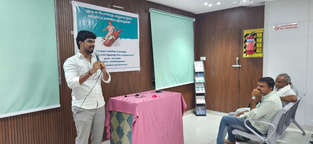 Women leaders of the locality, including Union Chairperson Tmt. Sundaralakshmi, Rural Development Group Leader Tmt. Jayasudha, and Women SHG Leader Tmt. Muthukkutti, addressed the gathering with strong messages on family well-being and the social impact of addiction. They emphasized the vital role of families and communities in guiding individuals toward de-addiction and rehabilitation. Their meaningful contributions ensured inclusiveness and strengthened the overall purpose of the program.
